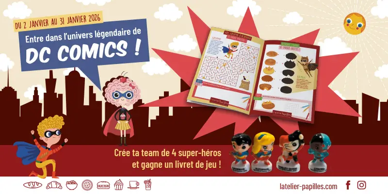 Le super-pouvoir de gagner des super fèves et de collectionner nos super-héros DC comics inspirés de Batman, Wonder Woman, Superman… et Éclair’Express, Super’Mie, Bat’Pain ou Frangipanette !