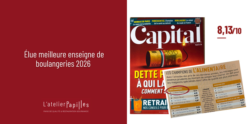 Chaque jour nous pétrissons et cuisons les pains sur place, et proposons des produits frais et de saison pour concevoir une carte de restauration gourmande et innovante renouvelée 2 fois par an. L’atelier Papilles fait preuve d’